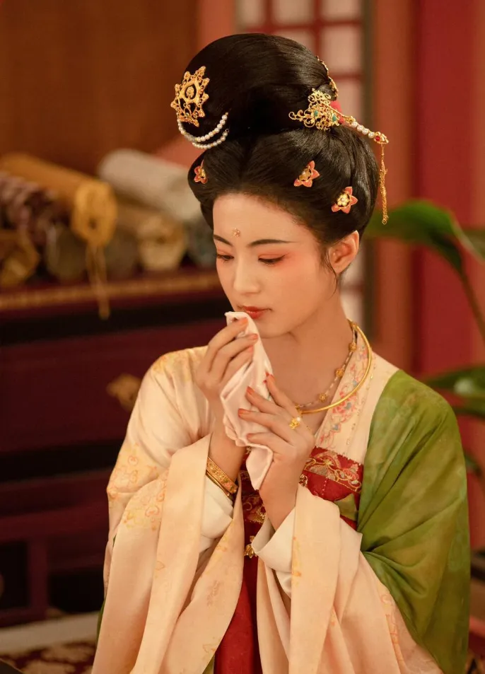 她一袭红色华服,配以唐风标志性的高髻簪花,尽显盛唐雍容气度。这张曾被网友誉为“天选大唐美人”的方圆脸,在唐妆衬托下更显珠圆玉润、大气舒展。