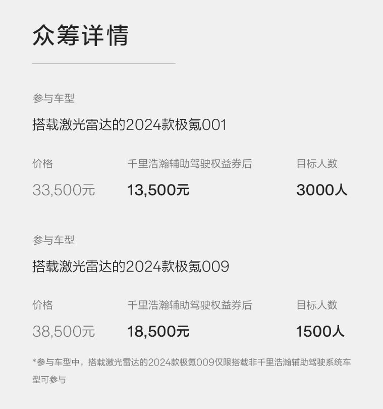 在新能源汽车行业,以众筹方式为老车主升级车辆硬件的案例并不少见,但极氪本次跨代际辅助驾驶软硬件系统切换,在行业内尚属首次。根据极氪官方消息,2025年11月24日至2025年12月24日这一个月,中国地区搭载激光雷达的非千里浩瀚辅助驾驶系统的2024款极氪001和极氪009车主,可通过极氪APP参与众筹升级。