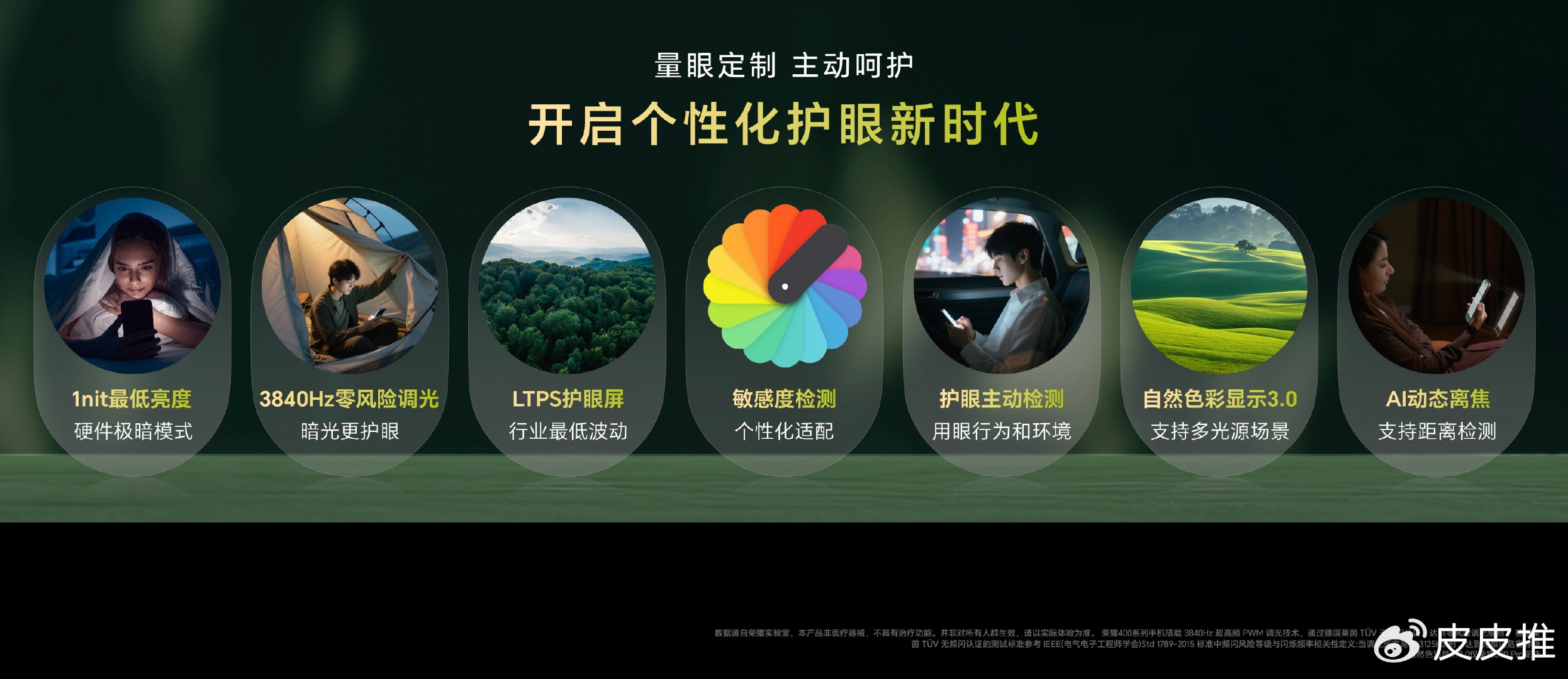 荣耀持续引领行业护眼赛道,荣耀500系列支持九大荣耀绿洲护眼特性,覆盖了自然光的波动、频闪、亮度、节律、光谱和色彩六大视觉维度,还提供了AI离焦护眼、AI干眼友好和晕动舒缓显示三大辅助护眼功能,不仅对于不良用眼行为进行主动提醒,还能智能检测不良环境光源,为用户构建对眼睛更加友好的居住和办公环境。