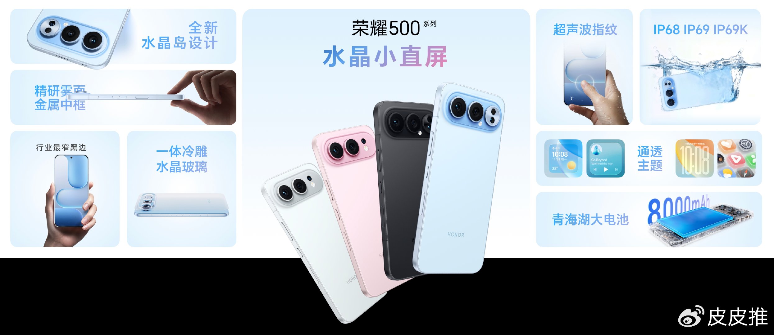 荣耀500系列还采用行业领先的一体冷雕工艺,历经40多道工序反复打磨,实现了镜头模组与背板玻璃的一体成型,质感浑然天成。得益于机身架构的重构,不仅实现7.75mm的轻薄机身和行业最窄1.05mm黑边,其独特的水晶岛镜头模组设计,也带来了更优的握持体验,无论是竖屏使用还是横屏游戏都舒适趁手,同时为超大电池预留出充足空间。