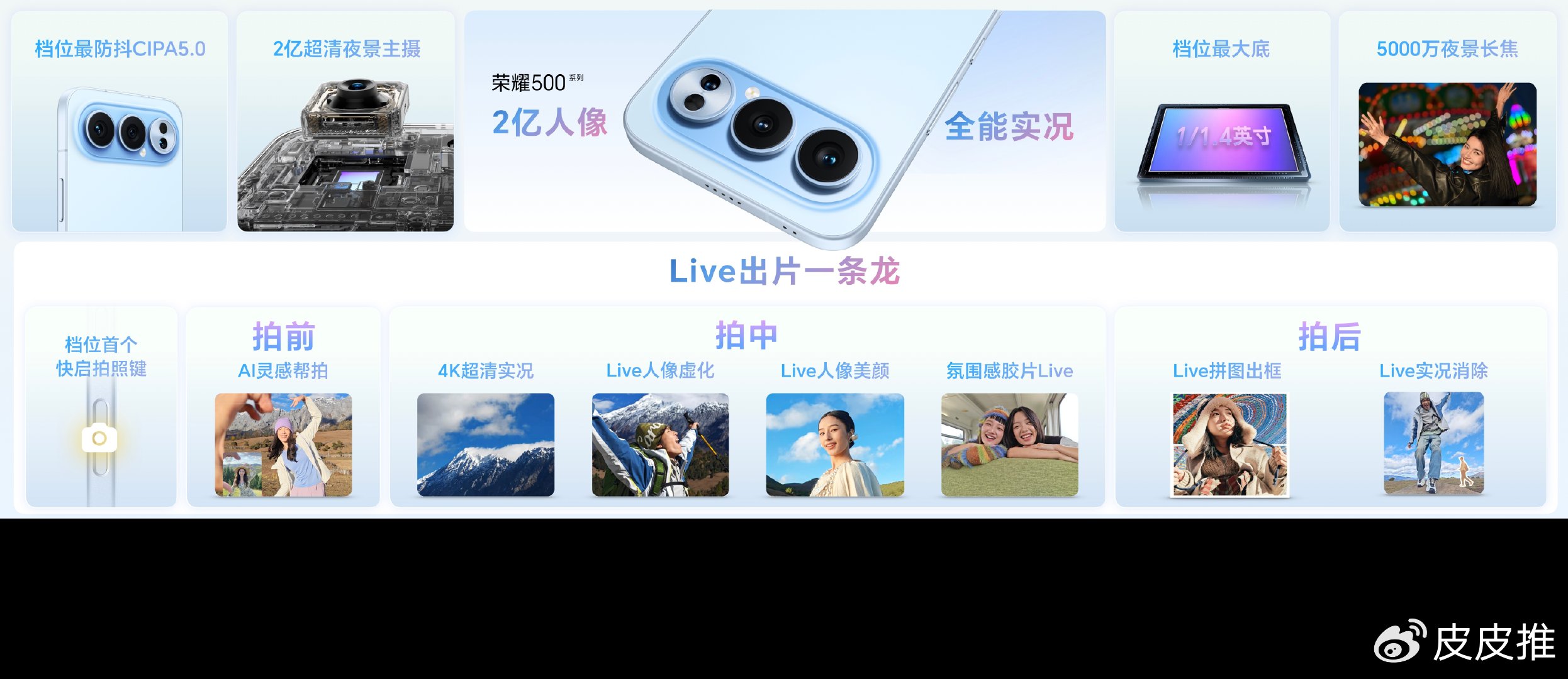 在影像体验层面,荣耀500系列带来档位超全实况体验,针对Live实况拍摄场景,行业首发前后置Live人像,让live帧帧有虚化,帧帧有美颜,帧帧有氛围。荣耀500系列还带来行业超全的氛围感胶片色彩,共有6种胶片Live任意挑选。同时,Live路人消除也让动态瞬间免受路人干扰,时刻主角。此外还支持4K转Live,轻松将4K视频转成4K Live分享朋友圈。