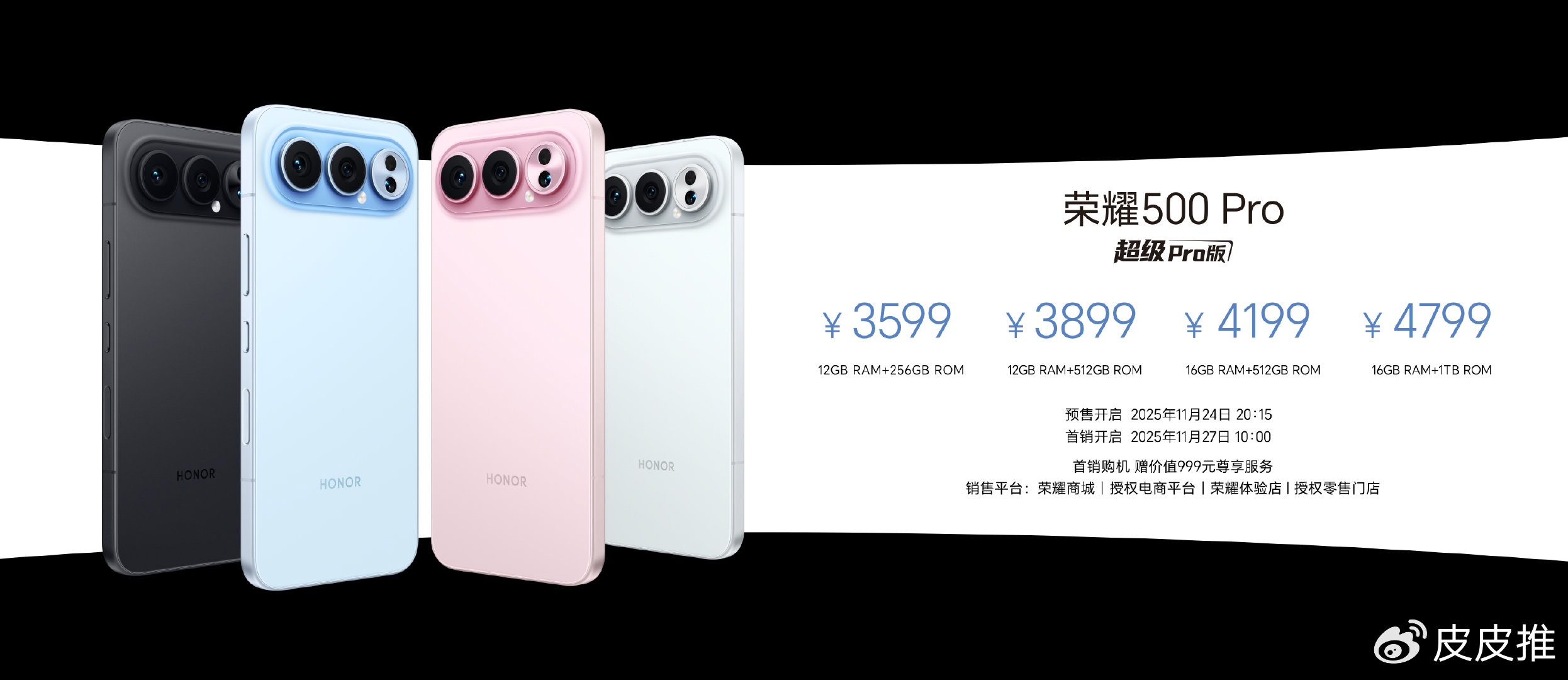 11月24日,荣耀500系列在杭州正式发布,该产品系列在“影像、性能、续航、外观、体验”等方面实现全维升级突破,重塑档位标准。荣耀500系列共两个版本,分别为荣耀500超级标准版与荣耀500超级Pro版,起售价分别为2699元、3599元,目前已经开启预售,11月27日10:00全渠道正式开售。