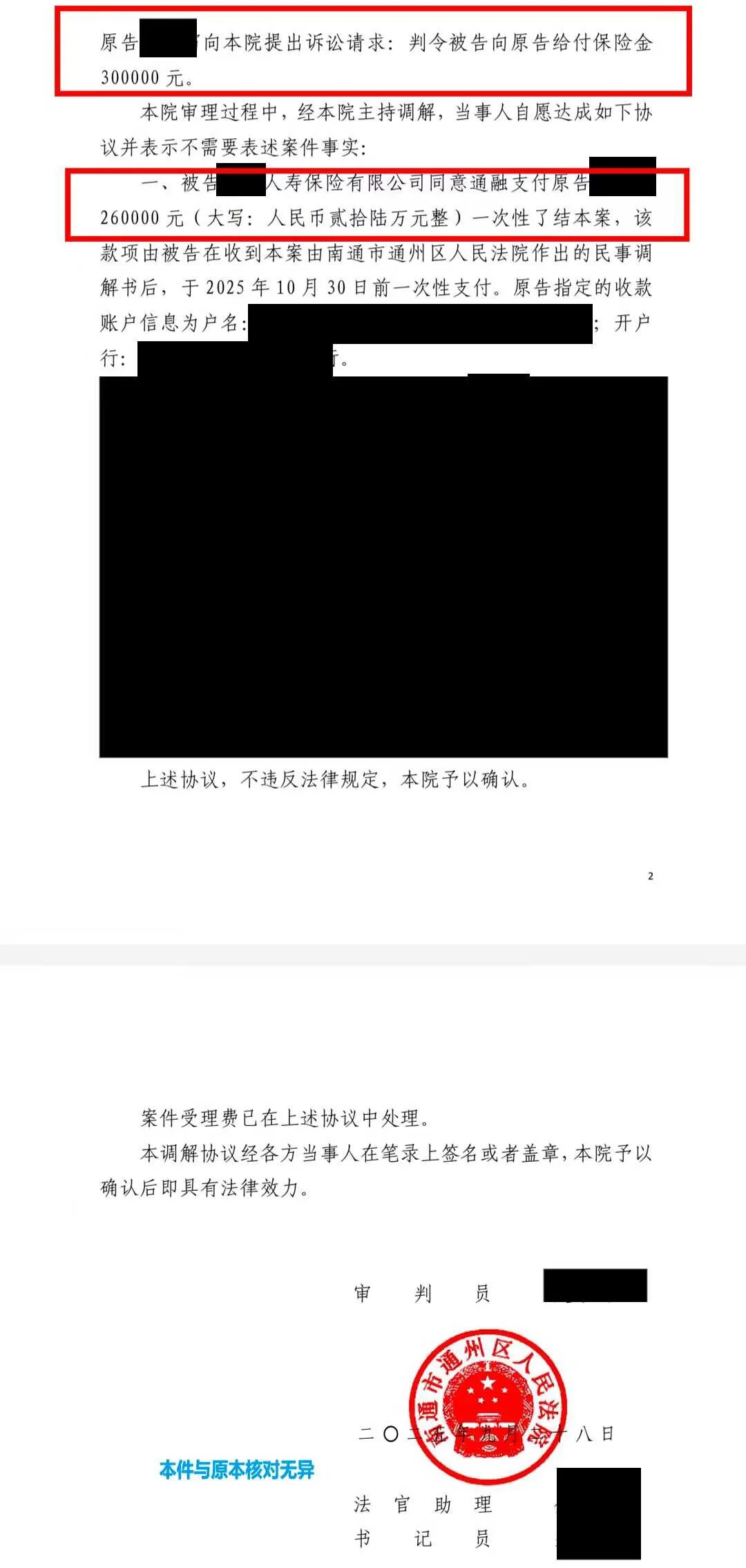 被告保险公司于2025年10月30日前一次性向原告张女士支付保险金26万元,双方就本案再无其他争议。