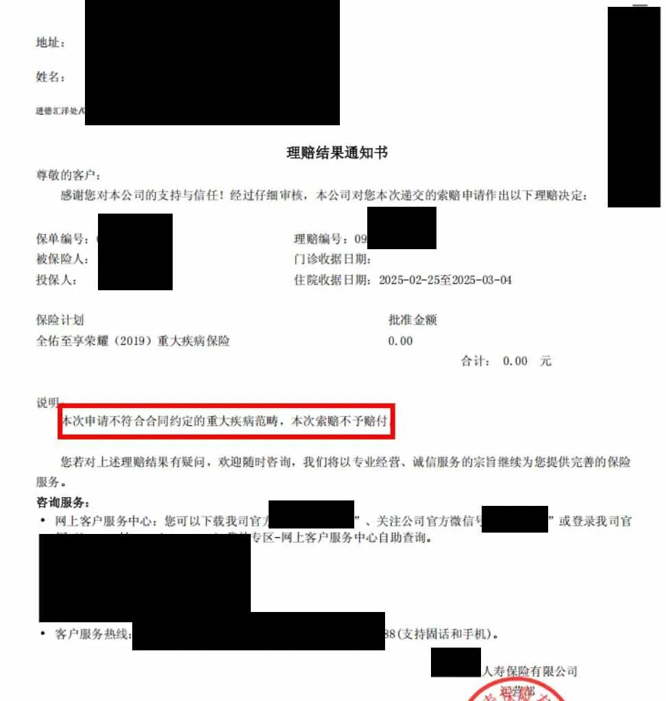 2025年3月,张女士向保险公司提交理赔申请,保险公司出具《理赔结果通知书》称:“本次申请不符合合同约定的重大疾病范畴,本次索赔不予赔付”,拒赔理由为张女士所患“交界性肿瘤”未达到保险合同中“恶性肿瘤”的定义标准。