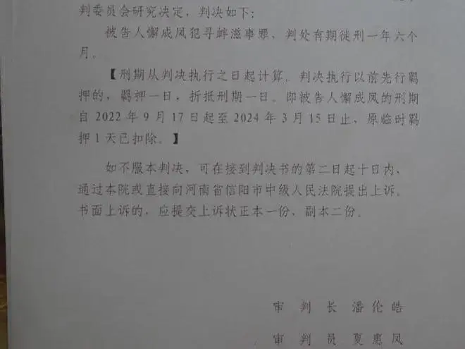 懈成凤一审获刑后即提起上诉,信阳中院对该案进行了多次开庭审理。2024年7月29日,该案二审第三次进行开庭审理。