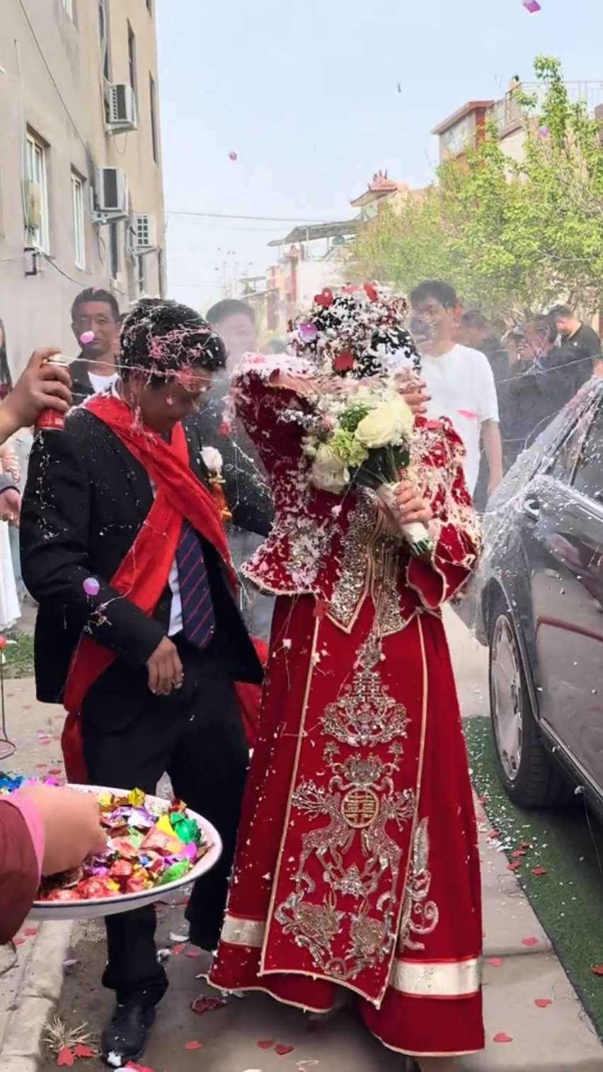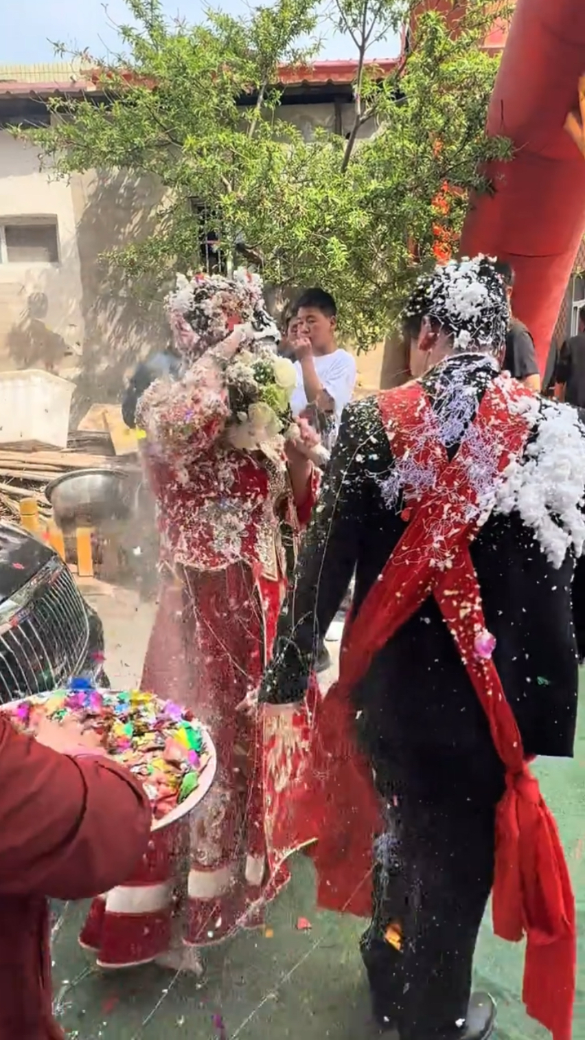 可是婚礼当天,让她有些不满。就在新娘下了婚车,准备按选好的时辰进新郎家的时候,男方家的亲戚往新娘和新郎身上喷了很多雪花喷雾。