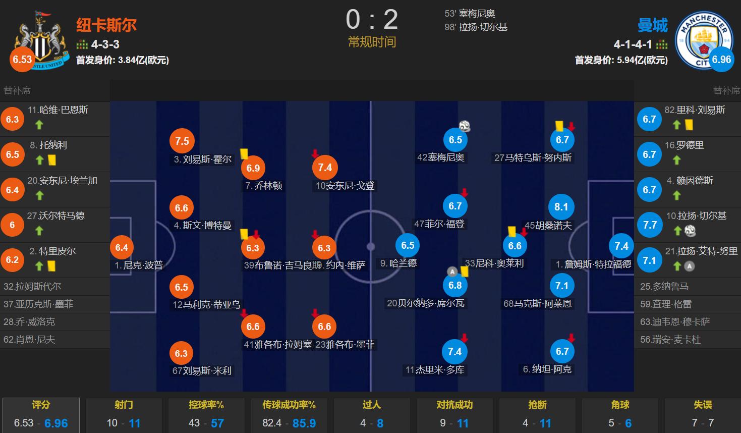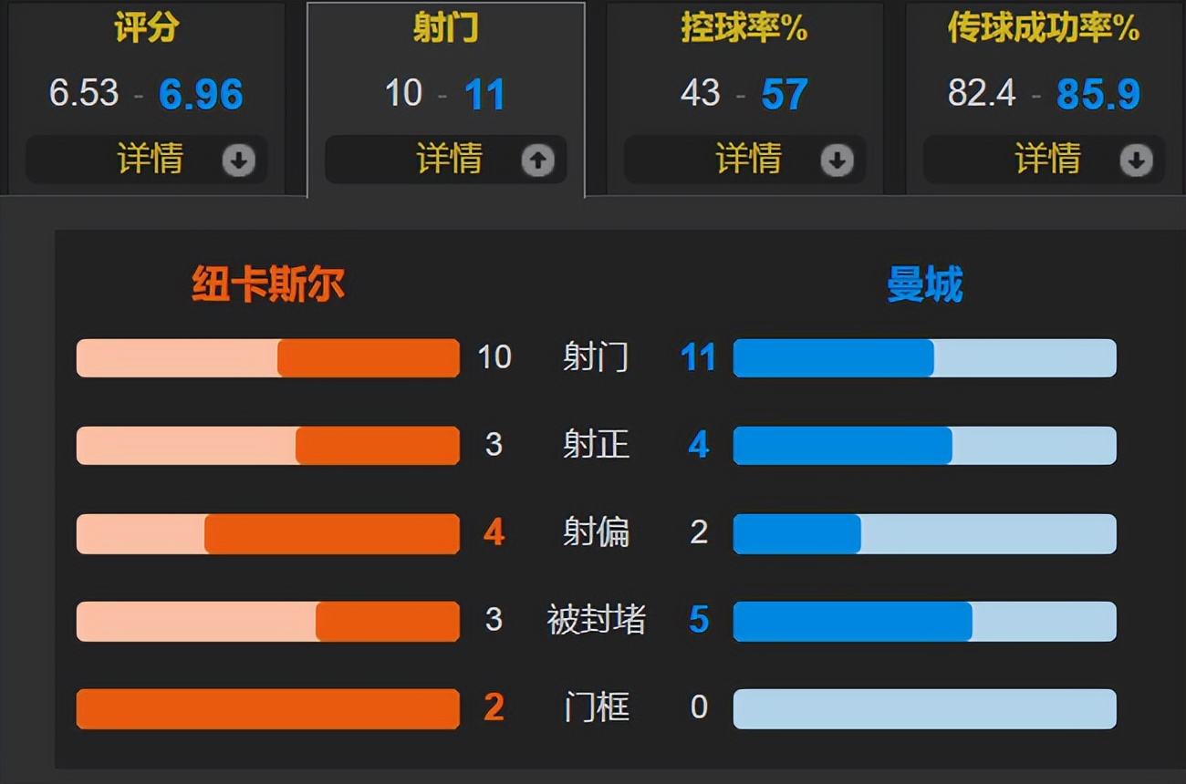 看比赛数据确实是异常势均力敌的比赛,曼城的控球率为57%,一共有11次射门,其中4次射正;纽卡斯尔一共有10次射门,其中3次射正。总之纽卡斯尔的主场不好踢,曼城2-0拿下就是完美的胜利。