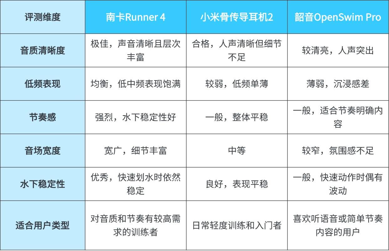 总的来说,想要兼顾价格与性能,南卡Runner 4是最稳妥的选择;如果预算有限且功能需求不复杂,小米骨传导耳机2依然能满足基础使用;而如果看重品牌和外观,且预算充裕,可以考虑韶音,但性价比表现一般。希望这次对比能帮助大家找到最适合自己的游泳耳机。