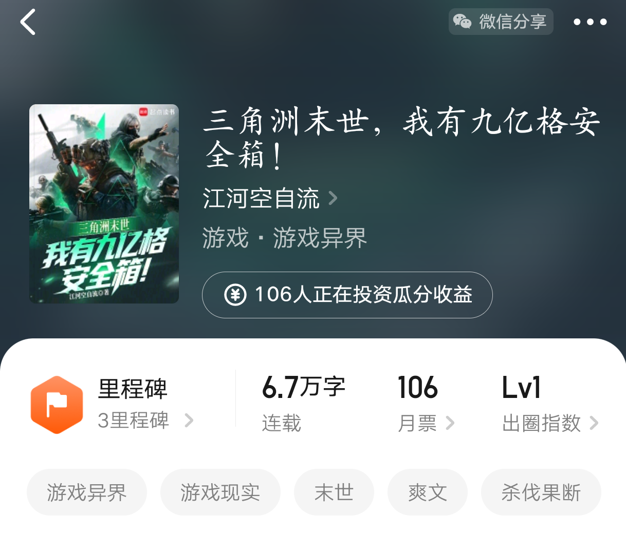 但唯一的问题大概是,主角开局的主线让人有点摸不到头脑,开始我以为是个赚钱文,后面又变成往安全箱里囤货?再后来主角又要努力攒钱买十个亿的房子?