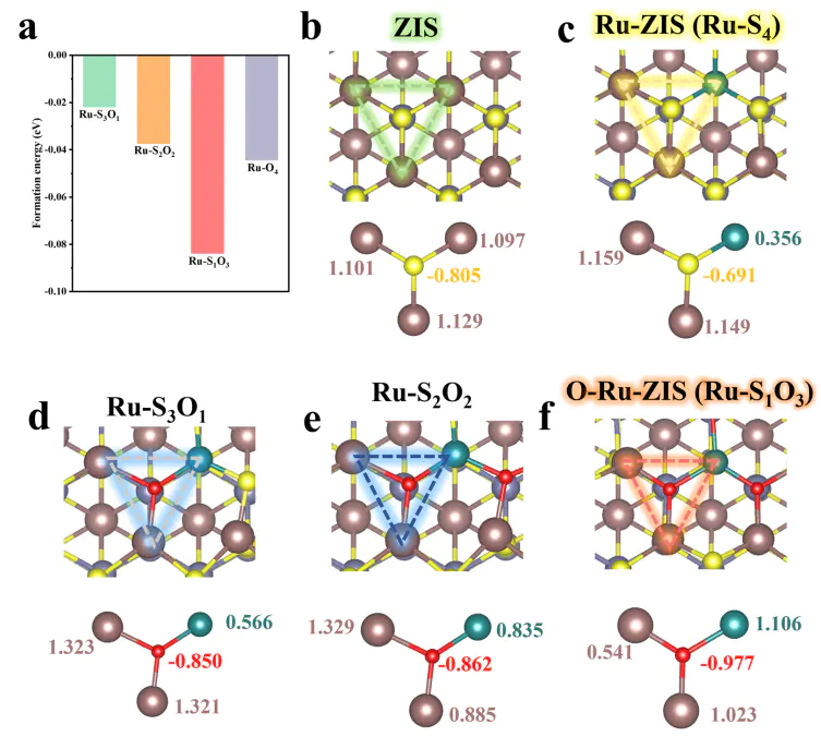 原位6):O-Ru-ZISXAS(图3解释了这一反转的结构根源—O引入导致Ru配位环境变为Ru-SO,电子云密度降低(正电荷富集),成为电子捕获位点。两者结合,阐明“结构变化(Ru配位环境转变)→电子态变化(Ru正电荷富集)→电荷转移反转”的因果关系。