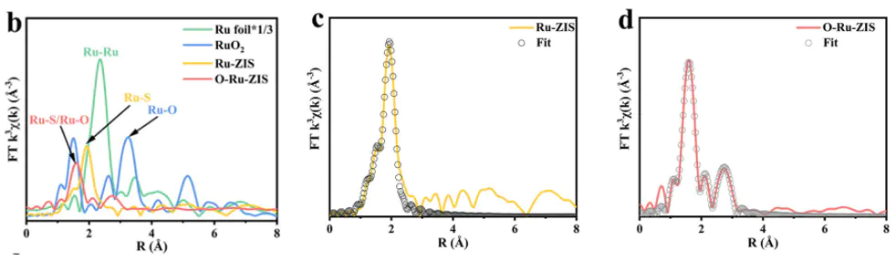 1Ru-ZISEXAFS谱与拟合:的EXAFS傅里叶变换(FT)谱在1.93 Å处出现单一强峰(图),拟合结果(图)显示的配位数为4.2,键长约2.38 Å,对应Ru-S配位结构(无或Ru-O键信号),证明未引入氧时,Ru以Ru-S形式取代326而的EXAFS主峰位置移至1.56 Å(介于RuO的与Ru-ZIS的1.93 Å之间,图b),拟合结果(图2d)表明Ru的配位环境转变为Ru-SO(个S原子+3个O原子配位),键长分别对应Ru-S(≈2.35 Å)与Ru-O(≈1.98 Å),直接证实氧原子通过取代S原子进入晶格,改变了Ru的局部配位环境。