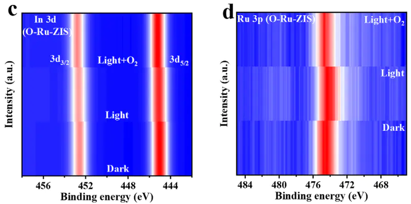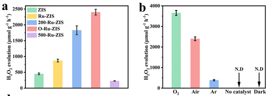 4光催化性能(图、b):O-Ru-ZIS的HO产率达-1-1O氛围),远高于(870.8 μmol gh)与纯326453.3 μmol gh);