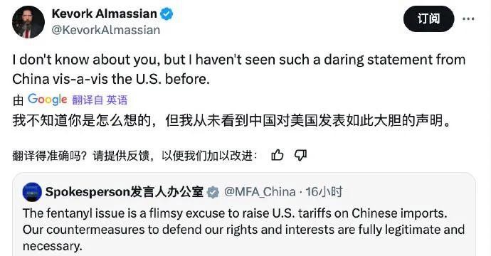 显然,我国此次的表态显得尤为坚定严肃,然而,这种态度并非无端而生,其前提是“美国若执意发动战争”。中国未曾主动寻求任何形式的冲突,无论是贸易争端抑或是关税争执。然而,若美国强行将“战争”一词强加于我,我们自然唯有奋力抗争至最后一刻。简言之,发言人的表态仅体现了我国“坚决抵抗”的决心,而非主动向任何超级大国发起“挑衅”。西方国家或许已经习惯了我国的“礼貌与克制”,对于如此直率的表达,他们或许感到有些“不习惯”。