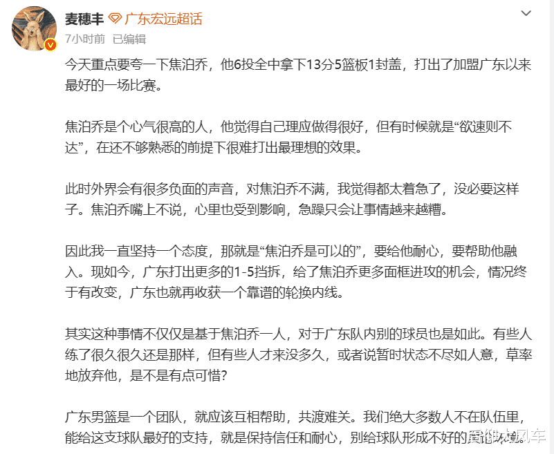 在王少杰缺席、王洪泽表现低迷的情况下,焦泊乔能有这样的表现已经非常完美了,赛后,媒体人麦穗丰也是不吝赞美之词称赞焦泊乔:我一直坚持一个态度,那就是“焦泊乔是可以的”,要给他耐心,要帮助他融入。现如今,广东打出更多的1-5挡拆,给了焦泊乔更多面框进攻的机会,情况终于有改变,广东也就再收获一个靠谱的轮换内线。其实这种事情不仅仅是基于焦泊乔一人,对于广东队内别的球员也是如此。
