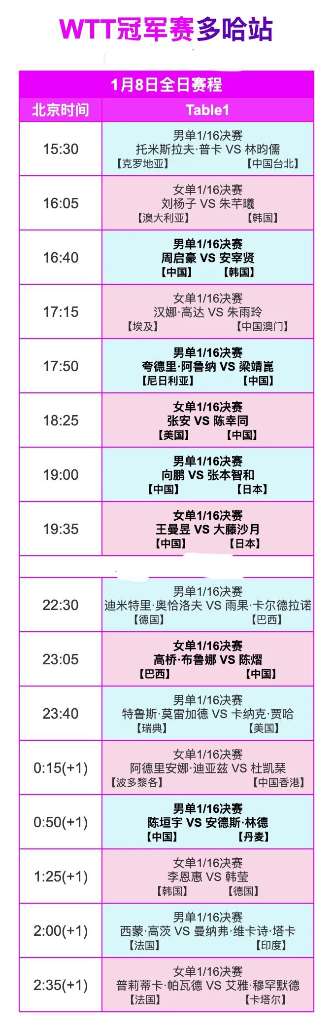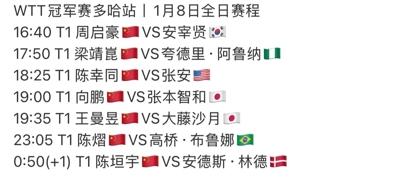 北京时间1月8日,WTT多哈冠军赛的火药味已经点燃。国乒来了个漂亮的“开场秀”,王艺迪、蒯曼、林诗栋三人齐奏凯歌,打出了一个三战全胜的完美开局,给球迷吃了颗定心丸。不过,这开心劲儿可能得稍微收一收,因为真正硬仗才刚刚开始。今天,国乒还有七员大将轮番上阵,对手一个比一个难缠,尤其是男队,上来就要碰韩国猛将和日本核心,这争冠路,一开头就布满了荆棘。