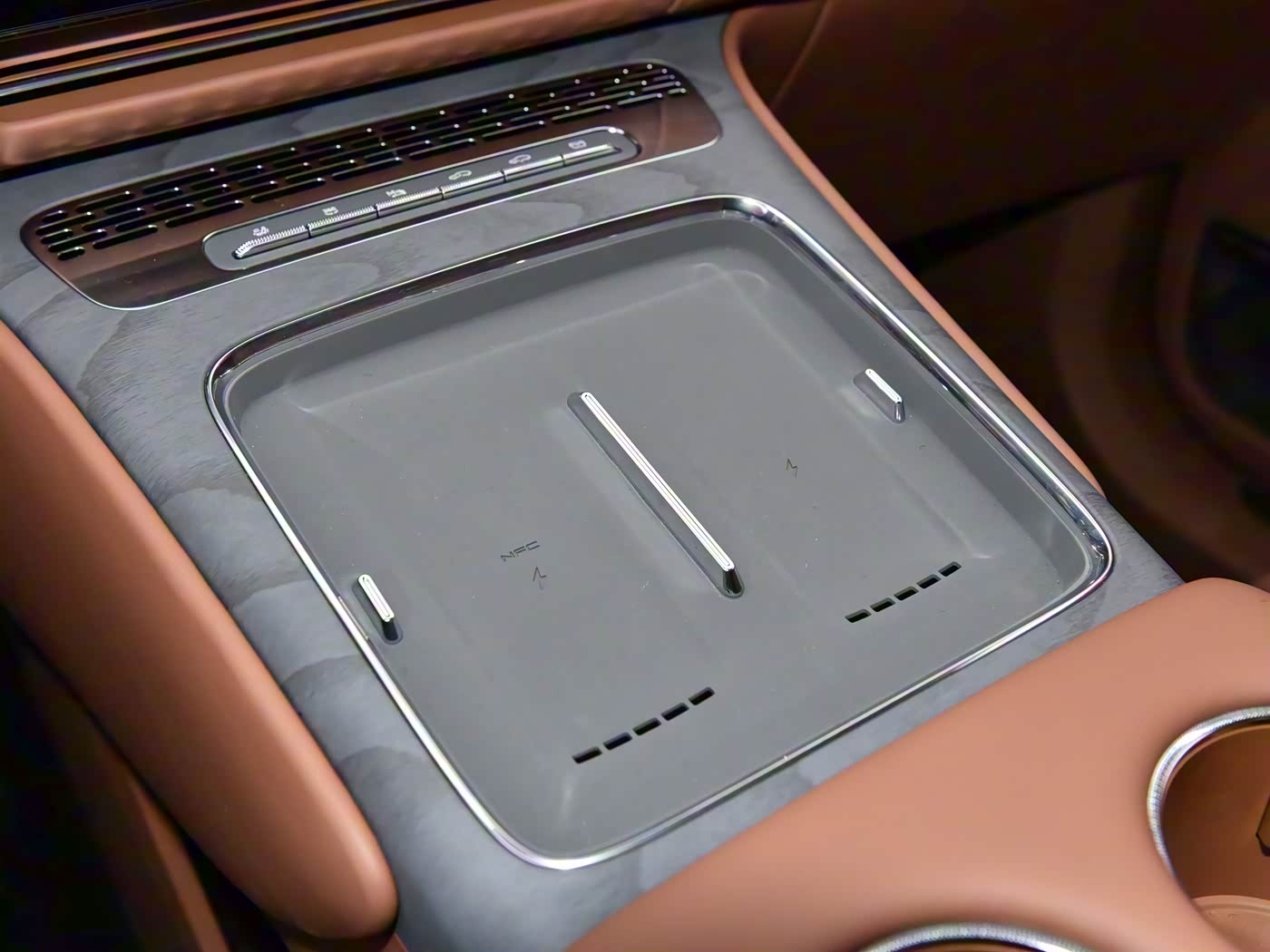 内饰方面,三辐式方向盘底部扁平,采用了撞色元素,显得十分运动。方向盘右侧底部,还能看到“怀挡”。前排地台上,设计了两块手机无线充电面板。