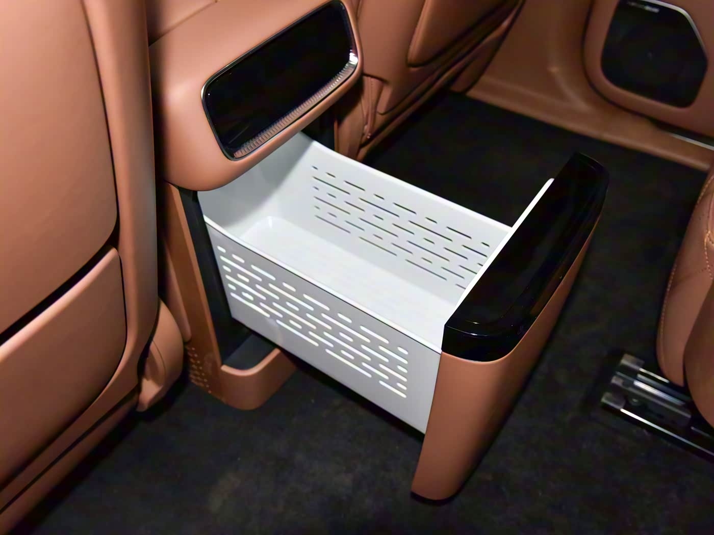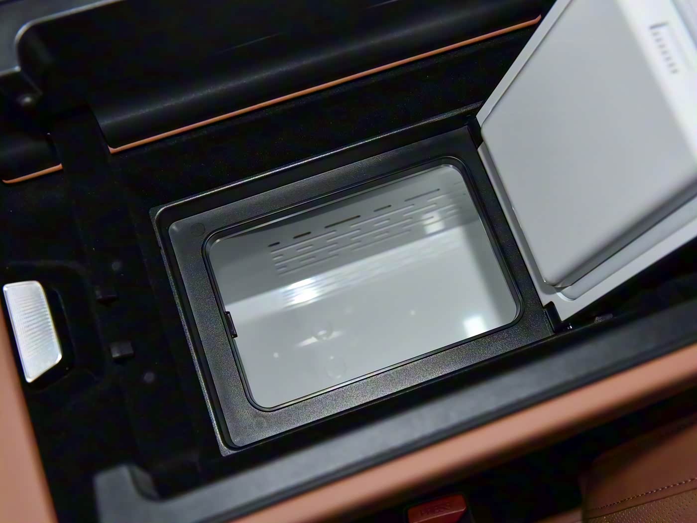 细节方面,开启前排的中间扶手箱,可以看到车载冰箱,而且车载冰箱还可以从后排开启,设计方面比较人性化,能够兼顾到前后排乘客的使用需求。