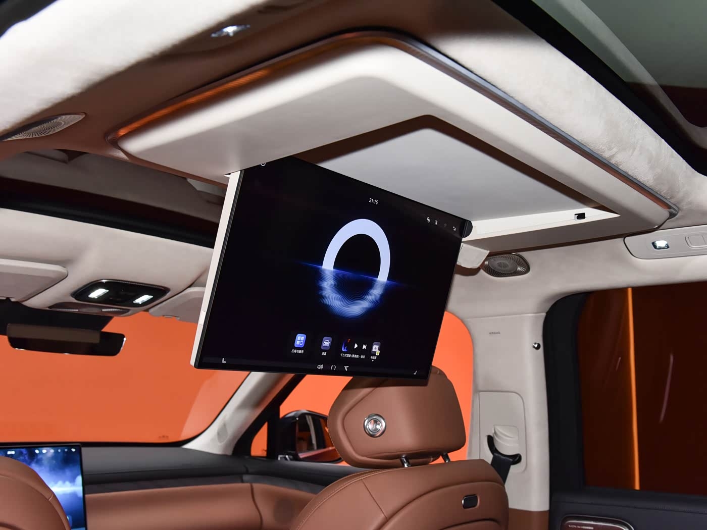 在主驾座椅后方,还配备了一块吸顶娱乐屏幕,采用的也是鸿蒙系统。