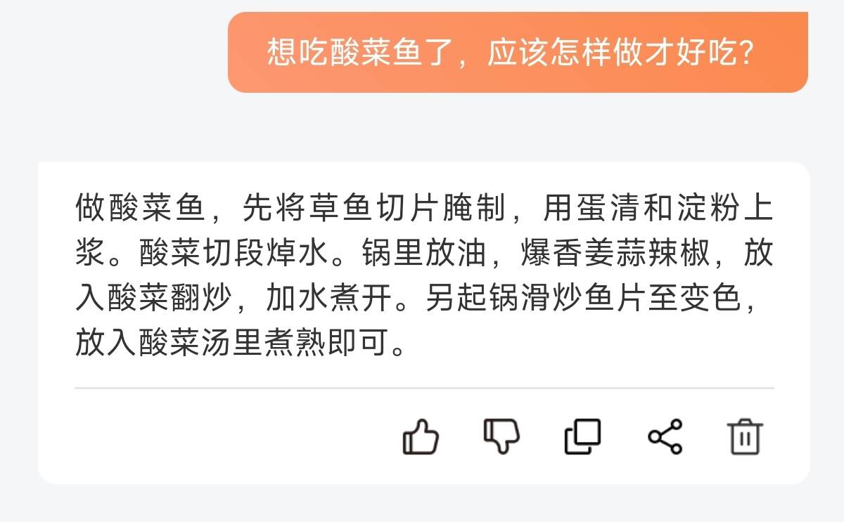 有一次,想吃酸菜鱼了,但不知道具体的做法。我就问它这道菜的制作步骤,它详细地给我介绍了所需的食材和烹饪方法,让我轻松做出了美味的菜肴,省的我再去查找各种教程了,很是省事。