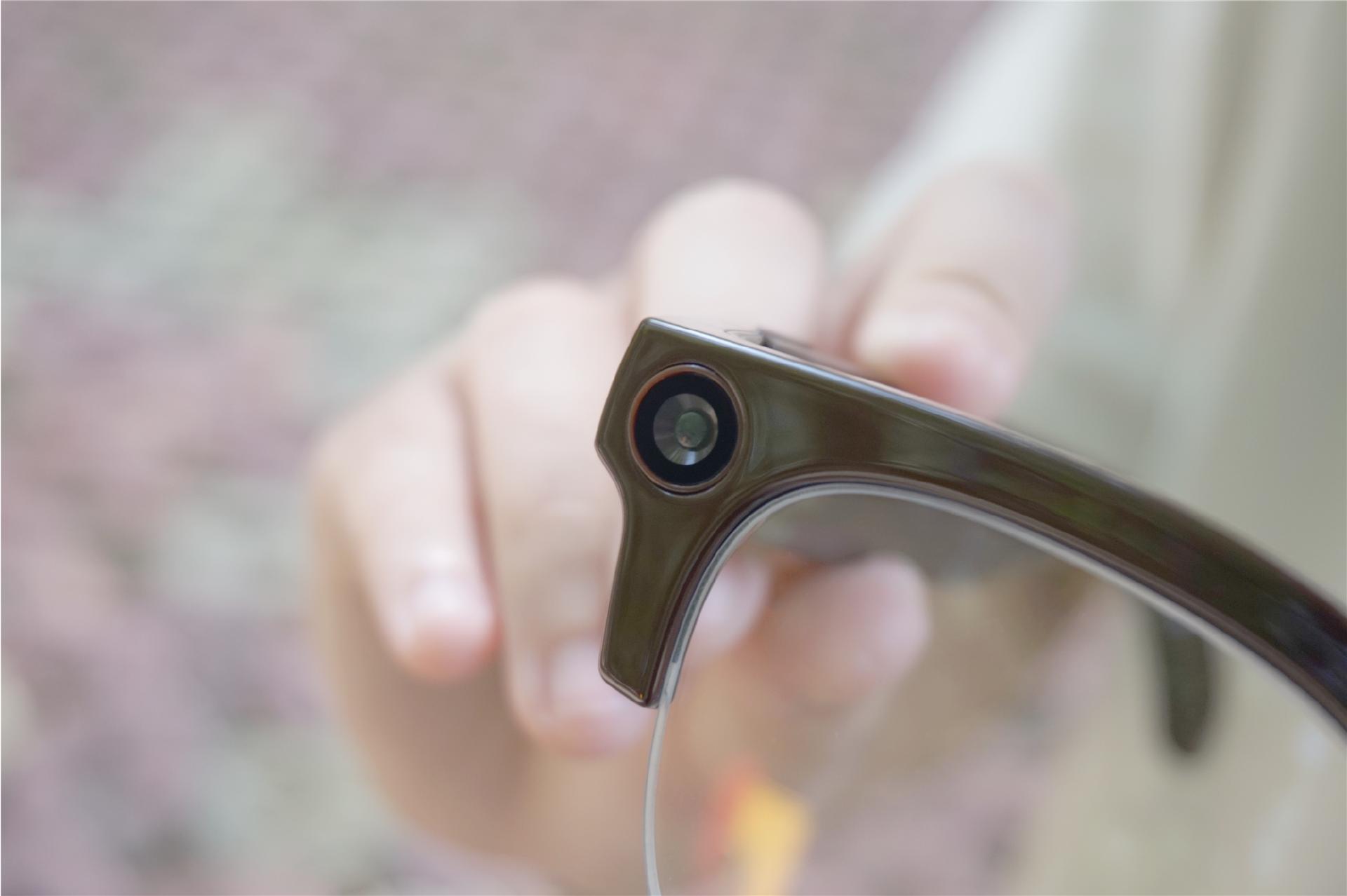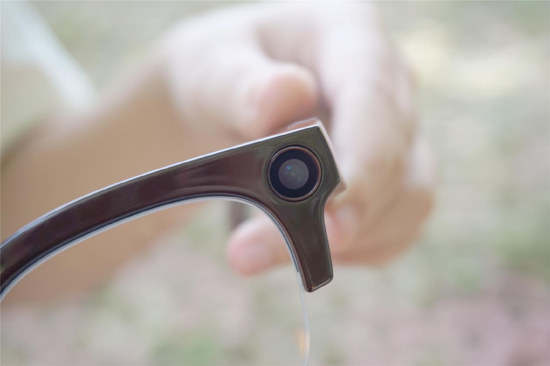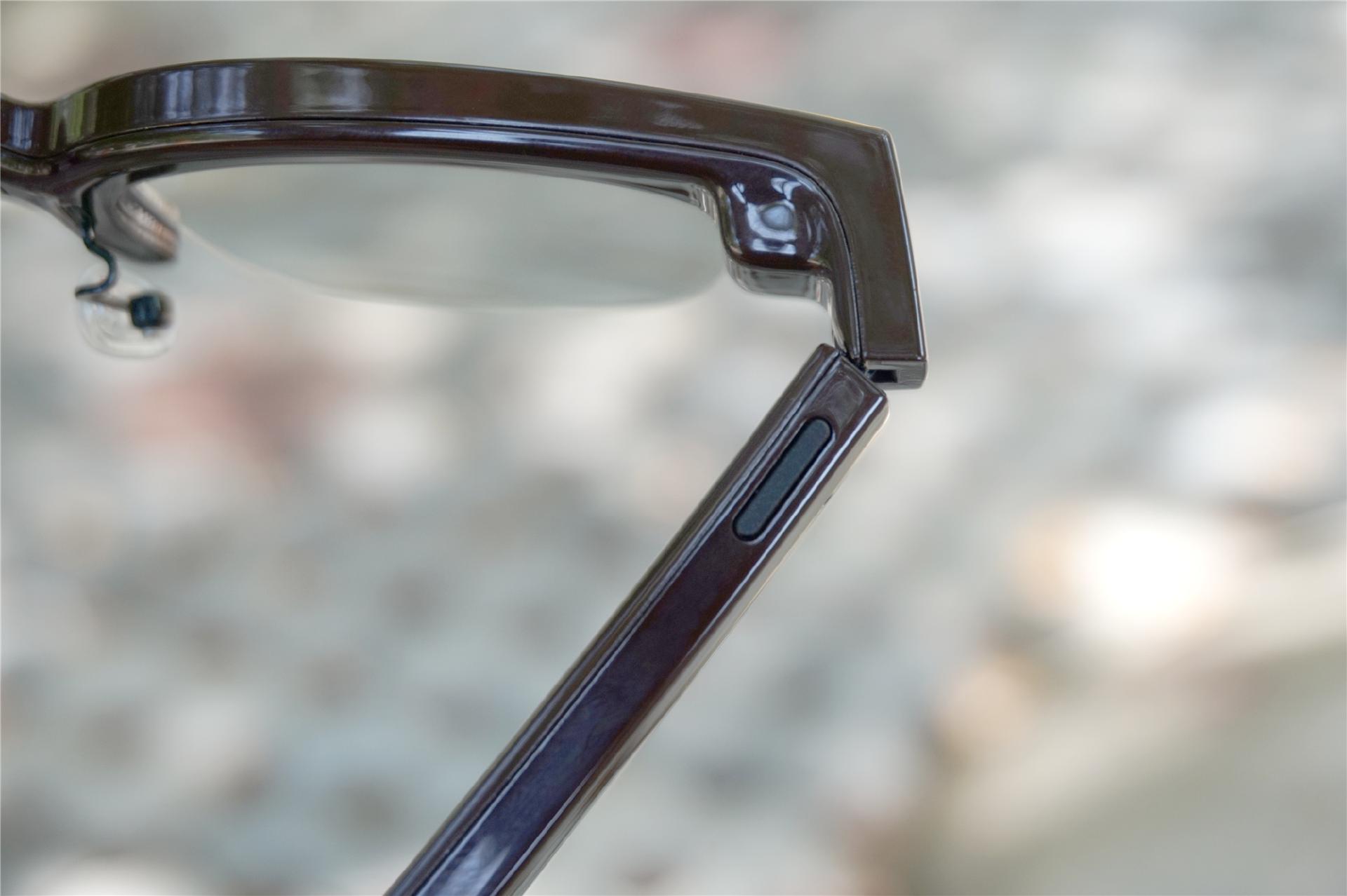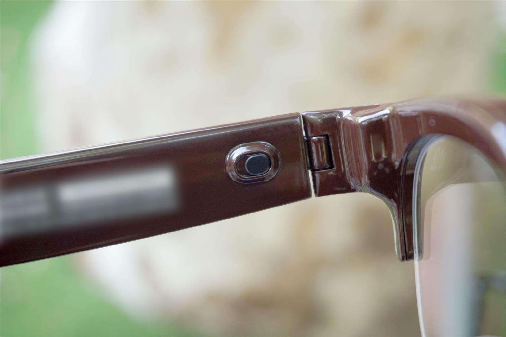 而在右侧镜腿的上方位置则是一颗拍照键。这颗拍照键设计的位置也很合理,拍照时可以很自然的摸到,盲操作无压力。