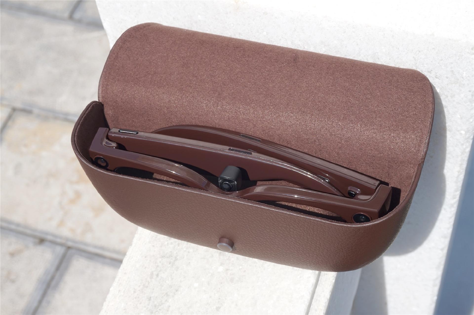 还有,该智能眼镜的充电也是在这个眼镜盒中进行的。不佩戴眼镜时,将其往眼镜盒中一放,既完成了收纳,又完成了充电,完全不用担心会忘记给智能眼镜充电。