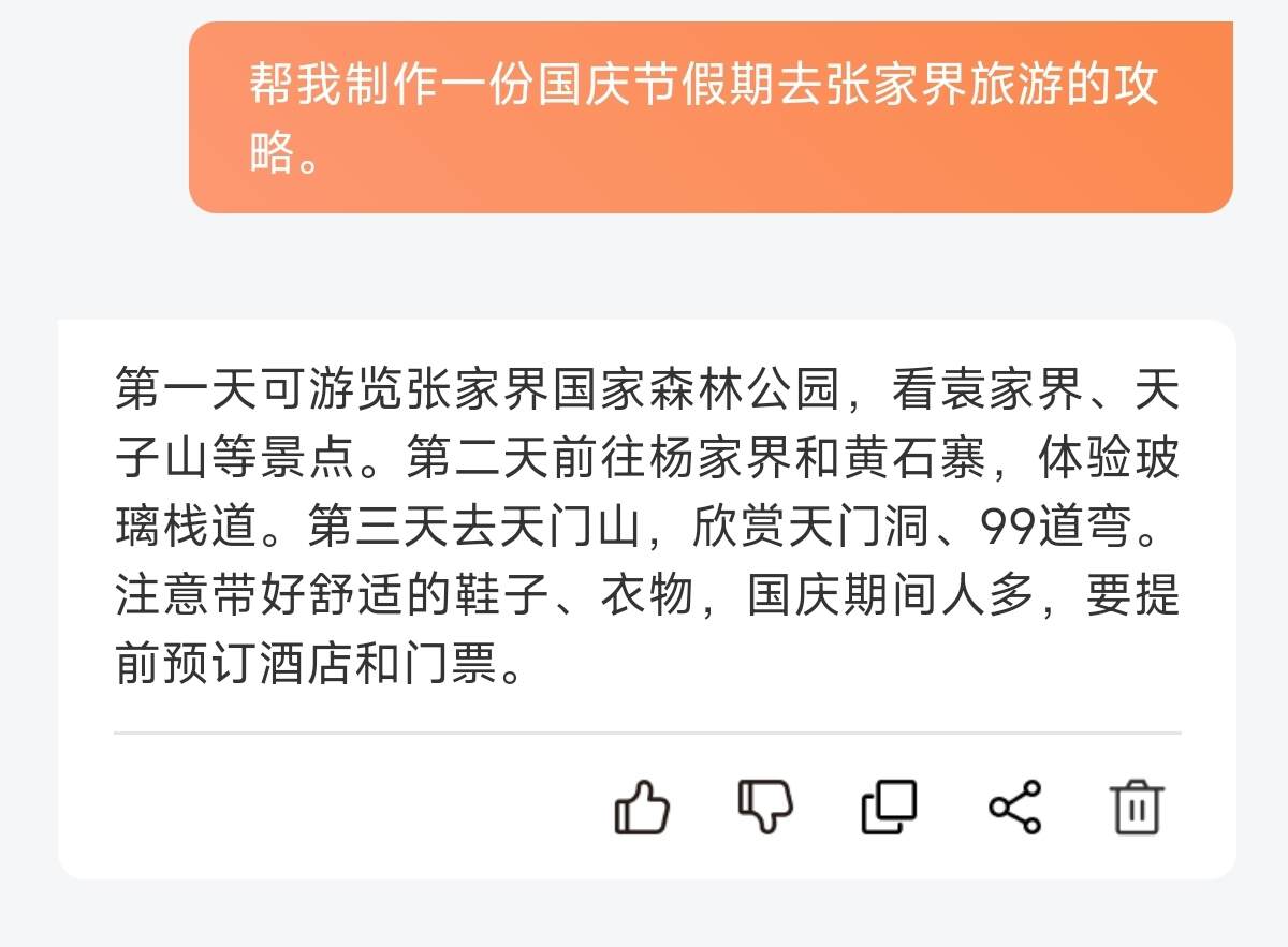 在日常生活中,我经常使用它的AI问答功能。除了日常询问天气之外,我还会让它给我一些出行建议,比如做一个国庆节假期,去张家界旅游的攻略等。
