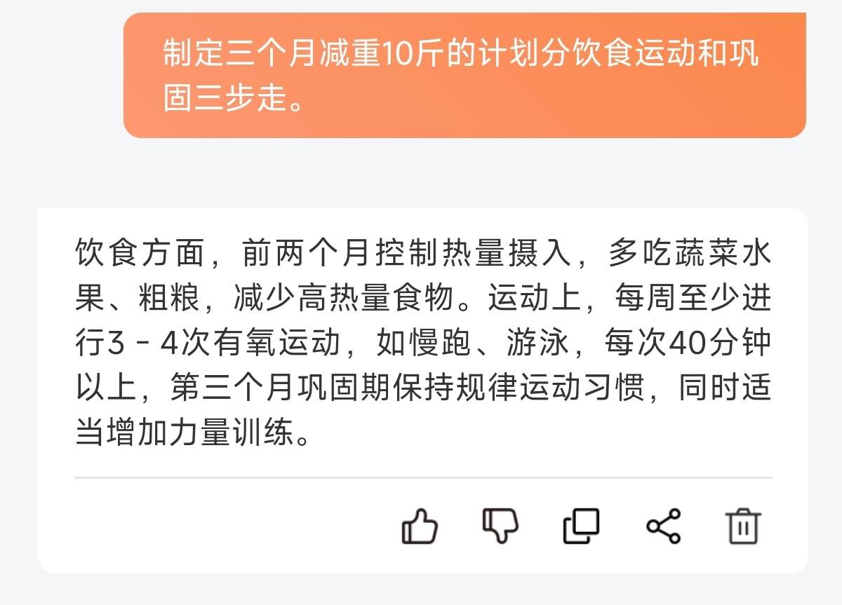 不仅如此,我还让它帮我出了一份3个月减重10斤的计划,并且需要按照饮食、运动和巩固三步走。面对这样复杂的问题,⽃战者天禧智能体眼镜G1101也同样给出了令人满意的回答。