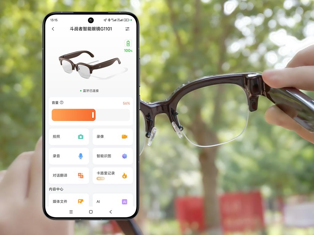 在使用上,⽃战者天禧智能体眼镜G1101需要搭配“智享家”APP,操作体验会更加丰富。比如,在APP上可以查看电量剩余、调整音量,以及拍照、录像、录音、智能识图等。各项功能非常直观,无需一级一级翻找。
