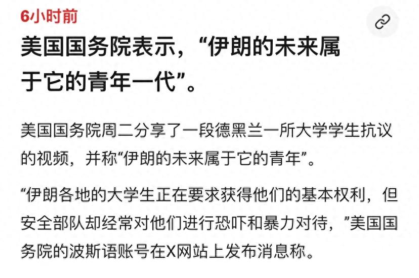 12月31日媒体引述美国国务院的社交媒体报道,它分享了一段德黑兰一所大学学生抗议的视频,并称支持伊朗年轻人。