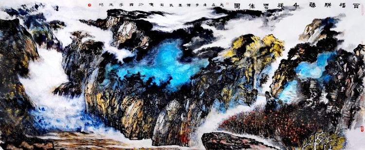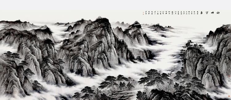 杨玉民先生的艺术不仅关乎美学,更关乎精神。他的连环画《铁人王进喜》被载入《世界美术教育史》,以豪迈的笔触刻画了新中国工业建设者的英雄形象。在这组作品中,他运用霜雪水墨的苍劲语言,将王进喜在冰天雪地中奋战的场景表现得淋漓尽致,使"铁人精神"在艺术层面得到升华。这种"工业题材+传统水墨"的创作模式,打破了文人画"不食人间烟火"的局限,让水墨艺术真正走进时代、走进人民。他的另一幅巨作《腾飞中國》,则以象征性手法描绘了中华民族的崛起。画面中,巨龙般的雪山蜿蜒盘旋,云气升腾,既有北宋山水的雄浑格局,又有现代构成的磅礴气势。霜雪画法列入非遗,书画润格居高不下,皆非虚誉。然其可贵处,在于"艺与道合"。身为多所名校教授,未尝以技炫人;享受国家津贴,仍潜心创作。此乃"大匠不示人以璞"之真君子也。