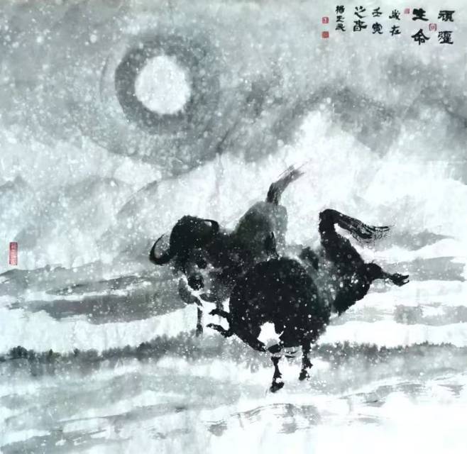 "天地有正气,杂然赋流形。"观杨玉民先生之作,但见霜雪精神充盈尺素,浩然之气弥漫丹青。杨玉民先生的创作始终带着一种工业文明的厚重感与自然风雪的灵动性的奇妙融合。他的代表作《风霜雪域》被载入中国国家画院教学文献,画面中霜雪非止自然之物象,实乃艺术家精神之外化。卢禹舜先生门下得真传,却不囿于师法,自创霜雪水墨一格,将北国荒寒转化为艺术之壮美,此所谓"师古而不泥古,创新而不离宗"者也。