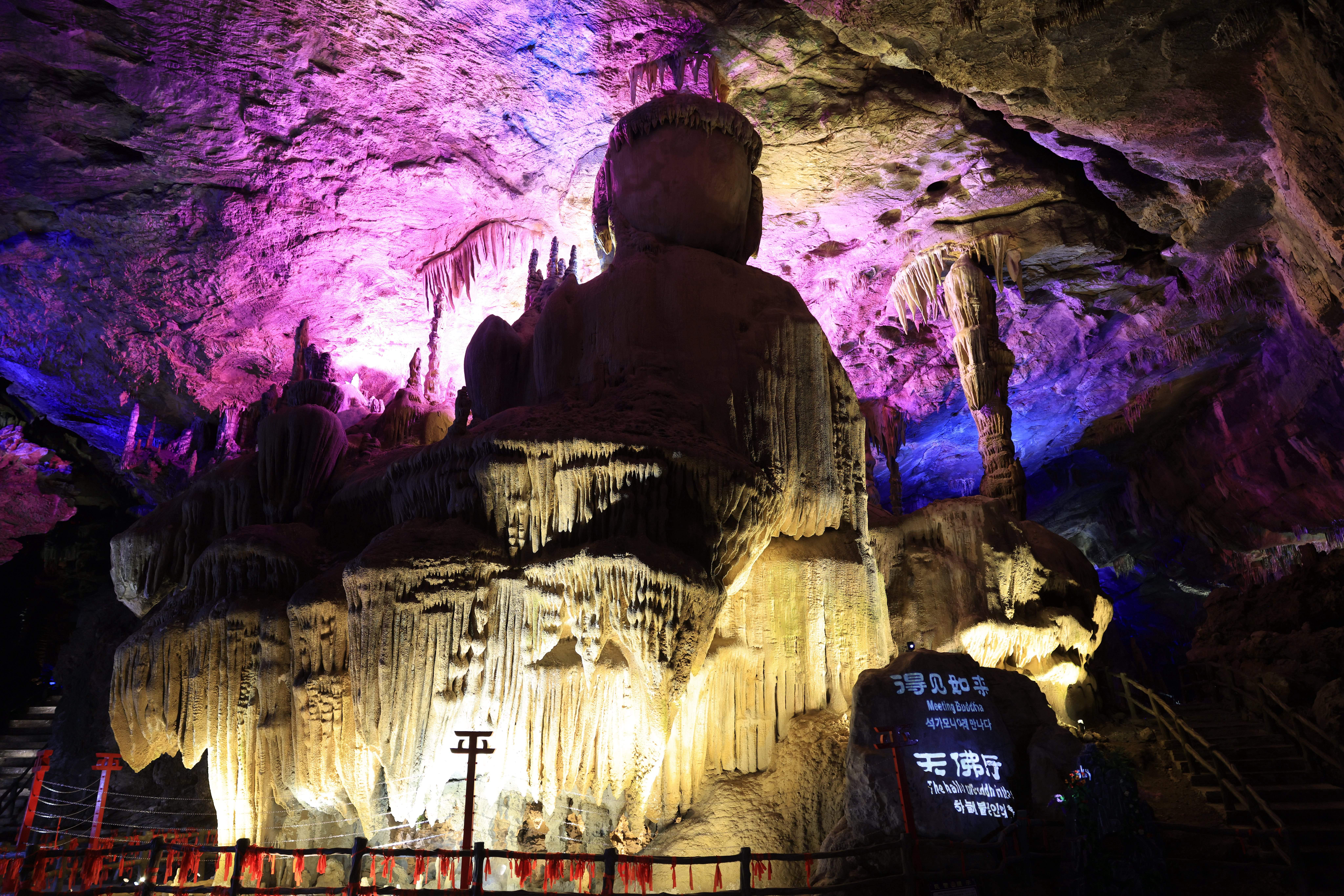 走到 “天佛厅” 时更是忍不住停步:正中央的钟乳石天然长成了佛像的模样,头顶的紫色灯光像给它罩了层佛光,旁边的祈福带被风轻轻吹着,连空气里都多了点温柔的仪式感。