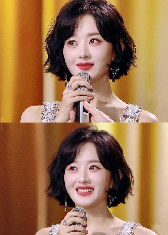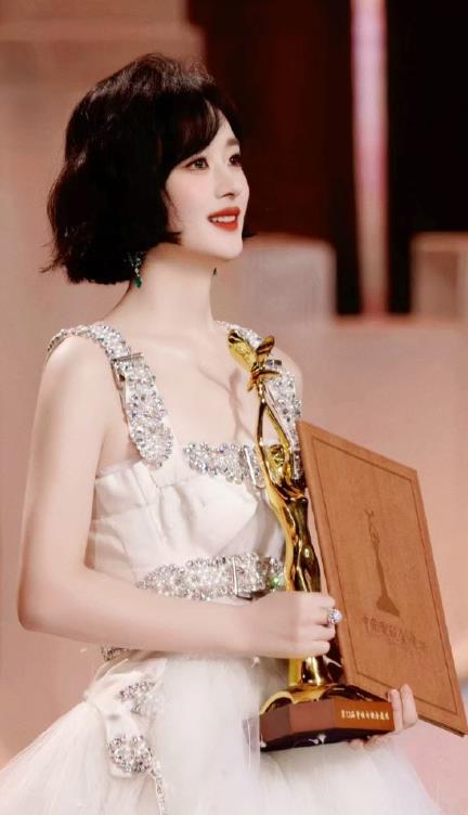 2023年10月,在金鹰奖的颁奖现场,赵丽颖拿着奖杯,眼中闪烁着泪光。