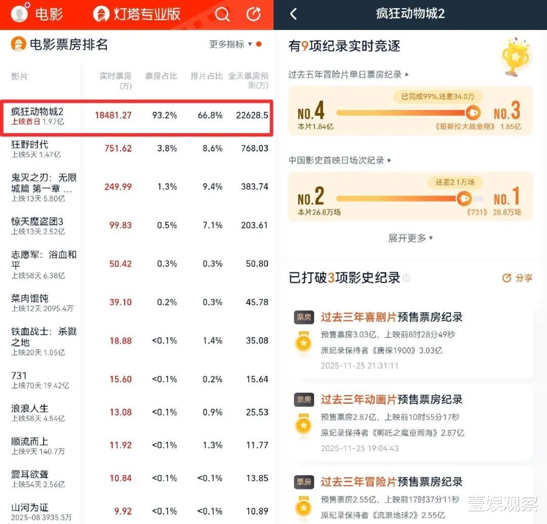 同步北美上映的《疯狂动物城2》,其国内预售票房让好莱坞电影重温到了美好的旧时光:据猫眼专业版数据,其预售票房(含零点场)超3.091亿,超越《哪吒之魔童闹海》刷新中国影史动画电影预售票房纪录。