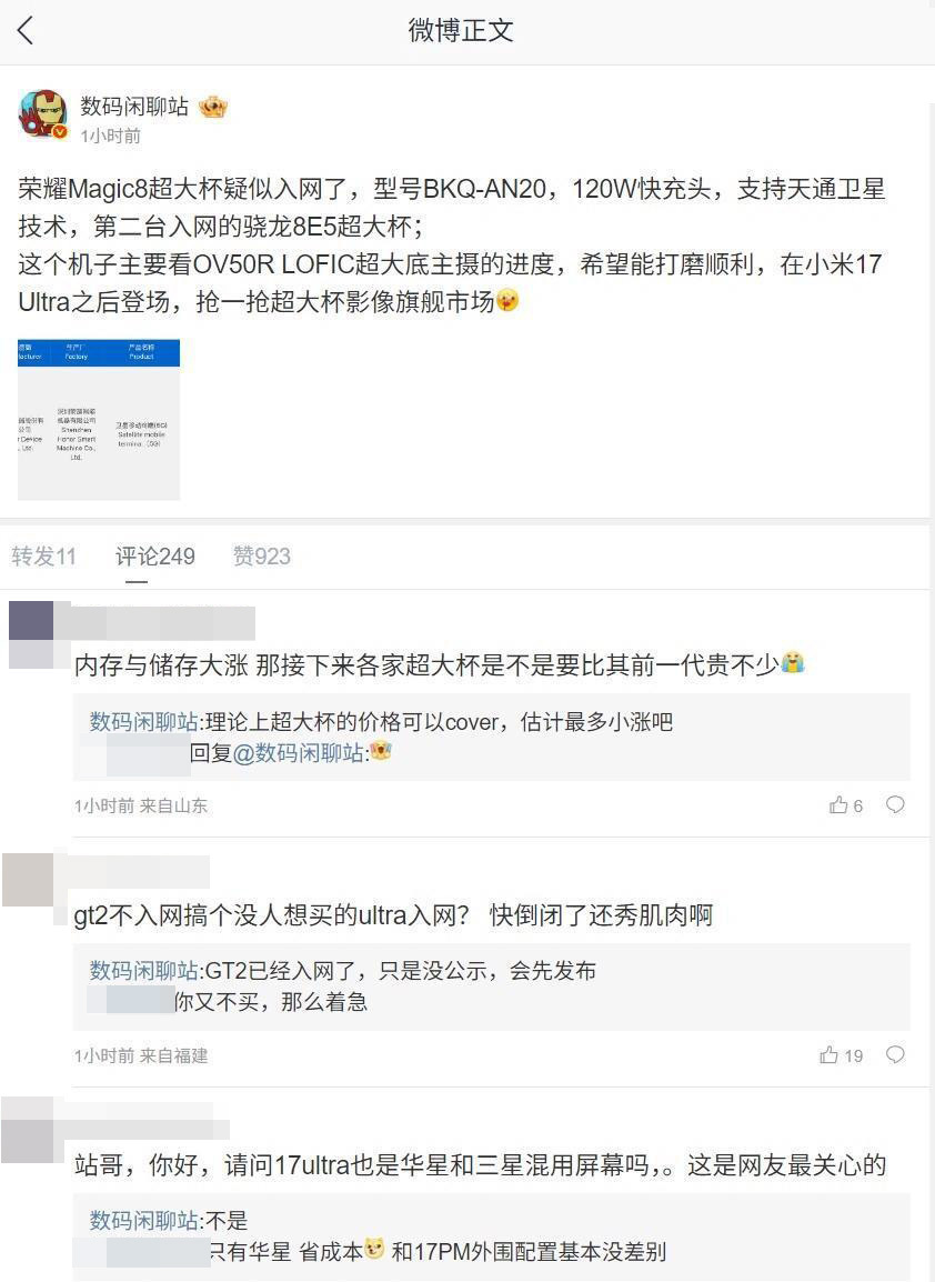 此外,在与网友互动时,针对网友提出的“内存与存储大涨 那接下来各家超大杯是不是要比其前一代贵不少”的问题,该博主回应称,“理论上超大杯的价格可以cover,估计最多小涨吧”。针对“gt2不入网搞个没人想买的ultra入网?快倒闭了还秀肌肉啊”的说法,博主回应称,“GT2已经入网了,只是没公示,会先发布”。