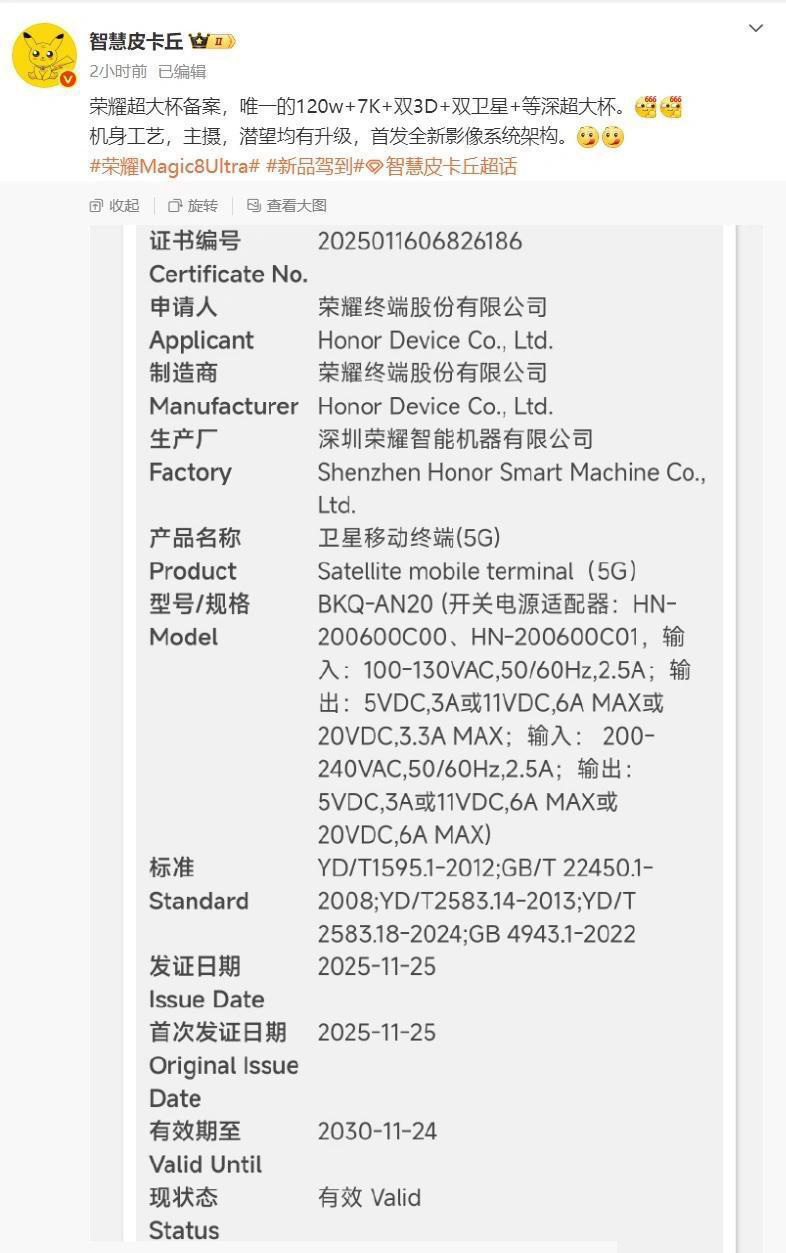 另外,日前,数码博主“智慧皮卡丘”也曝出了一张型号同样是BKQ-AN20的荣耀新机获国家质量3C认证的截图,并配文称,“荣耀超大杯备案,唯一的120w+7K+双3D+双卫星+等深超大杯。机身工艺,主摄,潜望均有升级,首发全新影像系统架构。”而该博主在爆料中带上了“#荣耀Magic8Ultra#”的话题,也就是说,此次在超大杯机型中,@荣耀手机 很可能给荣耀Magic8系列新增Ultra版,也或者用Ultra版取代之前的RSR保时捷设计。这就要等未来荣耀手机的官宣来确认了。