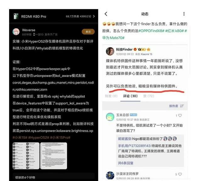 这些就是酷安网友爆出来的帖子,可以看到上面写的的是小米HyperOS2存在媒体固件对新平科技,小白测试的续航模式有特调优化,这是真的吗?