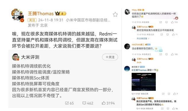 前段时间小米王腾还发文说友商的媒体机特调的越来越夸张了,而红米一直坚持一致调优,从而导致了被友商拉开了差距,在考虑要不要跟进?