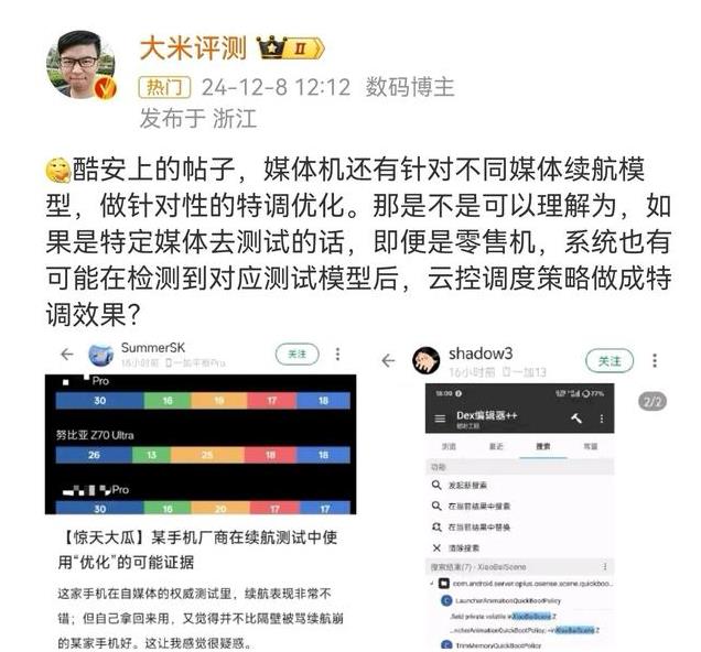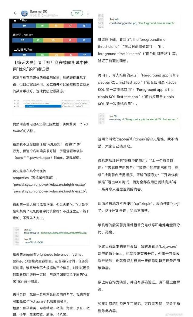 还有一个网友发了一篇长文,表示自己看到这些手机媒体测试的续航的非常不错,可买回来还不如其他家的好,所以很是疑惑,发起调查研究,一查被他发现了一些问题,意思就是针对媒体,手机的续航做了优化调优,各种常用的软件还有白名单。