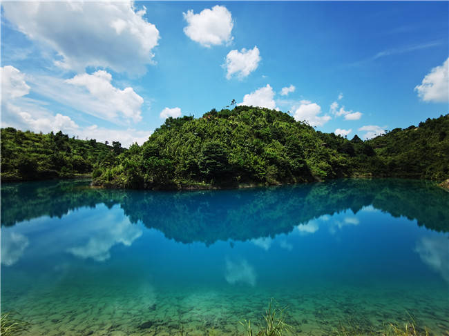 沿着蜿蜒山路前行,一池琉璃乍现眼前。池水因矿物质与光线折射呈现梦幻蓝绿色,晴日下如镶嵌山间的宝石,烟雨时又似仙境瑶池,被誉为“闽南小九寨沟"。