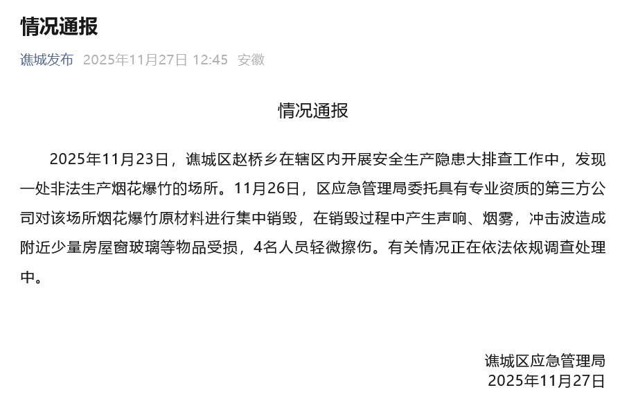 2025年11月23日,谯城区赵桥乡在辖区内开展安全生产隐患大排查工作中,发现一处非法生产烟花爆竹的场所。11月26日,区应急管理局委托具有专业资质的第三方公司对该场所烟花爆竹原材料进行集中销毁,在销毁过程中产生声响、烟雾,冲击波造成附近少量房屋窗玻璃等物品受损,4名人员轻微擦伤。有关情况正在依法依规调查处理中。
