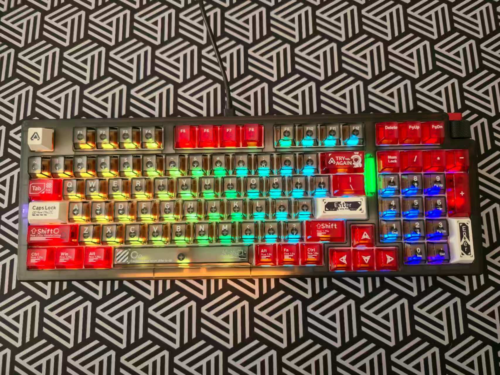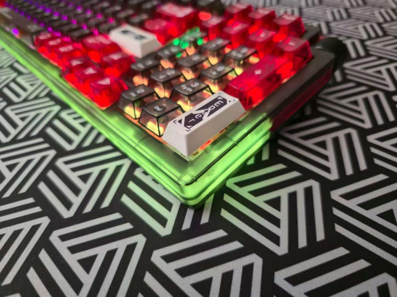 重点说说键盘本身!黑魅红配色真的太好看了,高分子透明外壳+黑红撞色键帽,不亮灯时是低调的暗黑系,透明外壳能隐约看到内部的填充棉和轴体,透着一股硬核科技感。