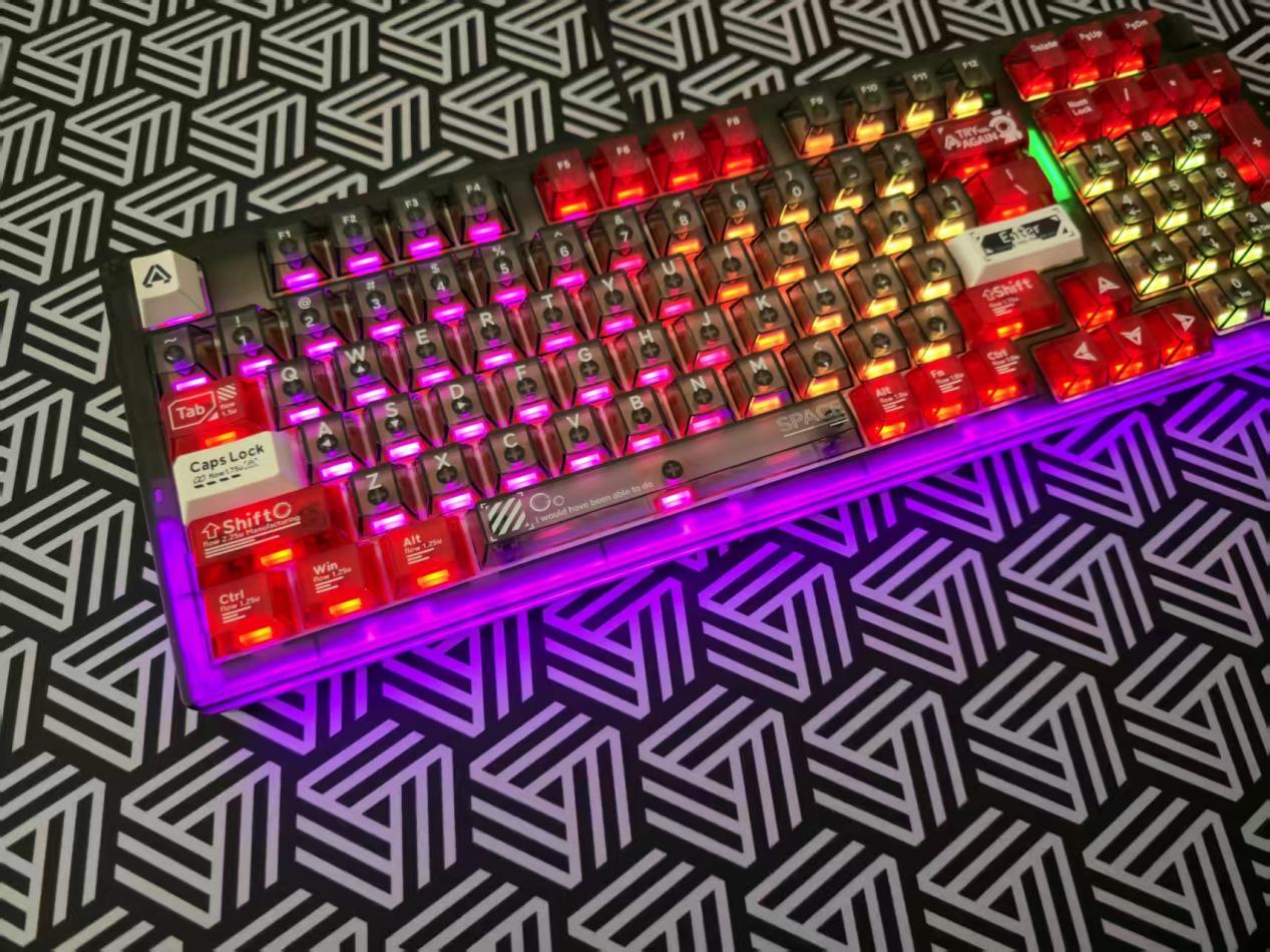 灯效细节也做得很到位:按 FN + 方向键↑↓能调亮度,晚上用调最低档,不会晃到枕边人;按 FN + 方向键←→能换灯效速度,打游戏时调快一点,灯光跟着操作 “快闪”,氛围感更足。最惊喜的是,它的灯光是下灯位布局,搭配高透键帽,光线穿透率比普通键盘高不少,但因为有透明外壳的漫反射,亮而不刺眼,哪怕深夜赶方案,也能靠这柔和的红光护个眼。