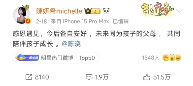 @陈晓 @陳妍希michelle :感恩遇见,今后各自安好,未来同为孩子的父母,共同陪伴孩子成长。
