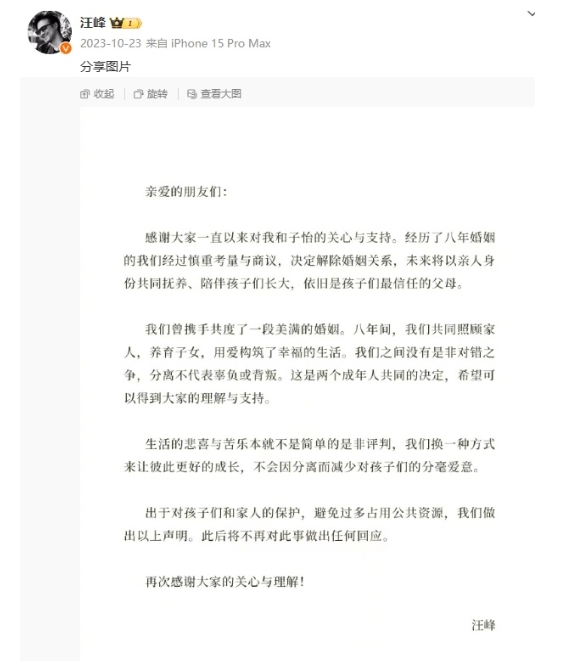 @章子怡 @汪峰 :我们之间没有是非对错之争,分离不代表辜负或背叛。这是两个成年人共同的决定。