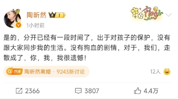 看到陶昕然官宣离婚的文案,不无遗憾。每当明星离婚,官宣文案也仿佛成了一门艺术,小鱼妹儿盘点了一下过往明星的离婚官宣文案,谁是你的意难平?@陶昕然:是的,分开已经有一段时间了,出于对孩子的保护,没有跟大家同步我的生活。没有狗血的剧情,对于,我们,走散成了,你,我,我很遗憾!