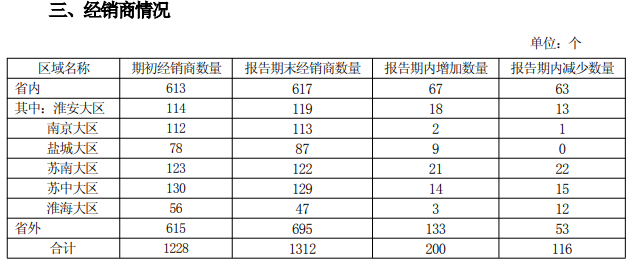 经销商数量方面,前三季度今世缘的经销商总数增加了84家,其中,省内市场增加4家,省外增加80家。其中,第三季度经销商共增加了13家,渠道扩张与业绩承压背离,成为今世缘的现实挑战。