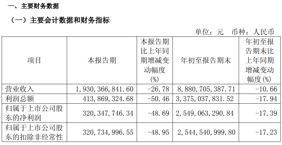 其中第三季度,公司营业收入为19.3亿元,同比下降26.8%;归母净利润为3.2亿元,同比下降48.7%。
