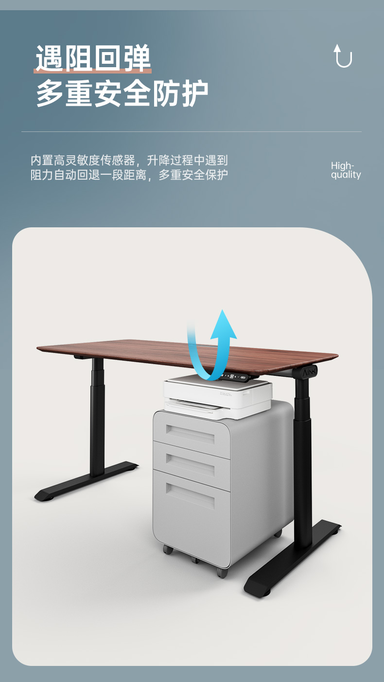 产品配备高灵敏遇阻回弹功能——升降过程中若意外碰到孩子的手、宠物或家具,会立即停止并回退3cm,有效避免夹伤或实木台面损坏;长按8秒即可开启童锁功能,锁定后无法调节高度,防止孩子误触或清洁人员操作失误,有低龄儿童的家庭也能放心使用。