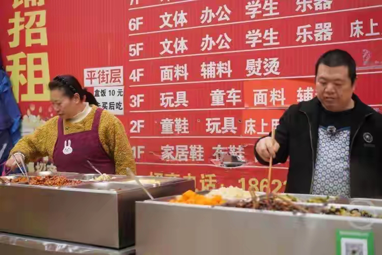 “妍姐家的饭,吃了十多年了!”市场摊主周先生捧着盒饭蹲在台阶上,扒拉一口饭满足地咂咂嘴,“味道就跟家里做的一样,不油不咸,吃着舒坦!”来这儿吃饭的人,大多是市场里的老面孔——进货的老板、卖布的商贩、靠力气吃饭的“棒棒”大哥,他们端着盒饭,或站或蹲,边吃边聊生意、唠家常,一顿饭的功夫,就能驱散一上午的疲惫。